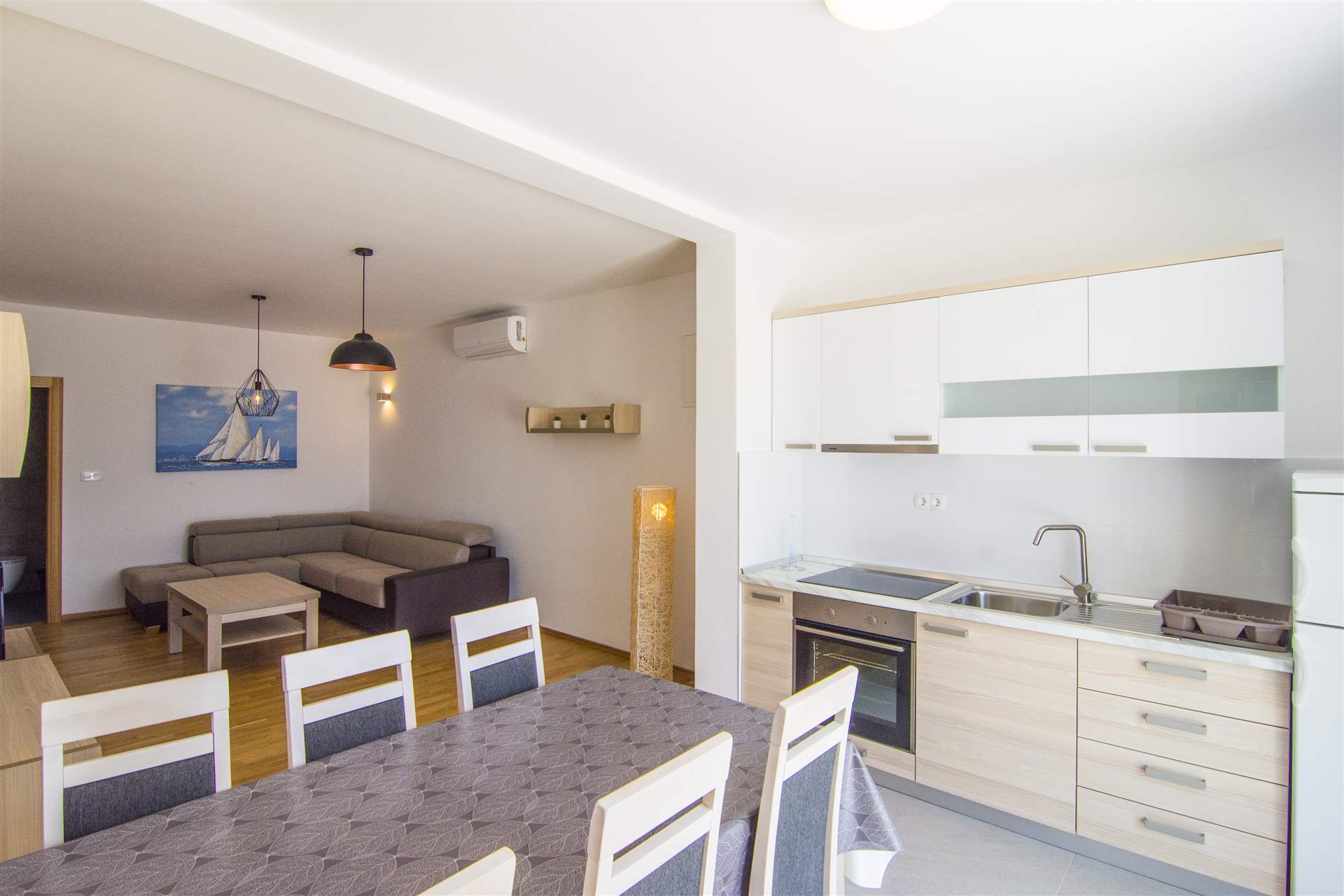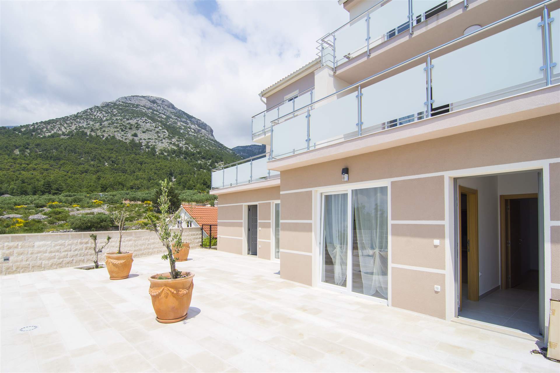 This apartment is in what is basically a new apartment building. The unit is spacious, clean, comfortable, full of natural light, and comes with a fully stocked kitchen, a large balcony with table/chairs, and an excellent AC system. Moreover, it is tastefully decorated. The building is conveniently situated in between central Bol and the famous Zlatni Rat beach, towards the periphery of Bol (but not at the absolute top of the village). Thus, returns require a bit of a hike up each day, but you're away from the crowds and have a super view of the Adriatic.