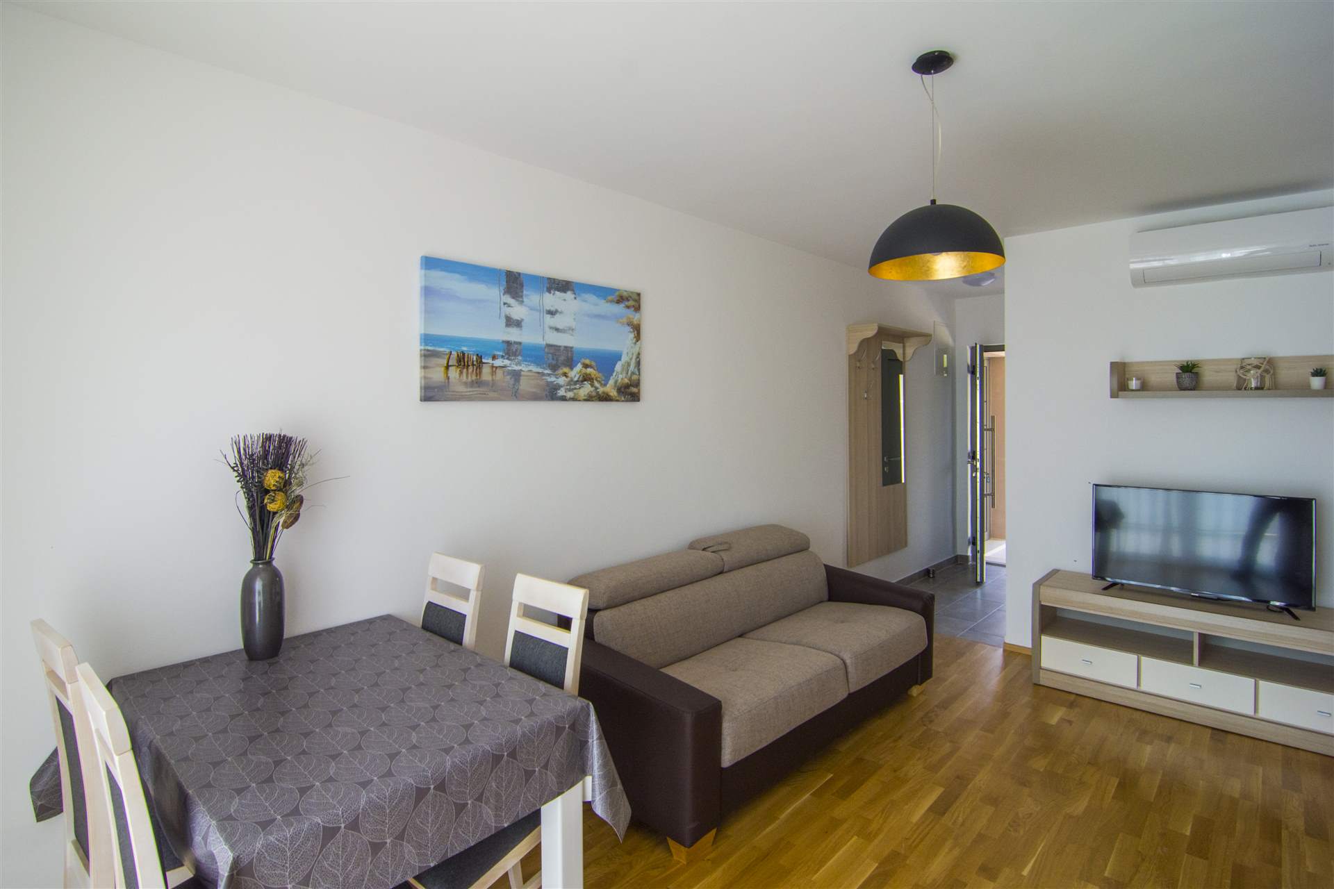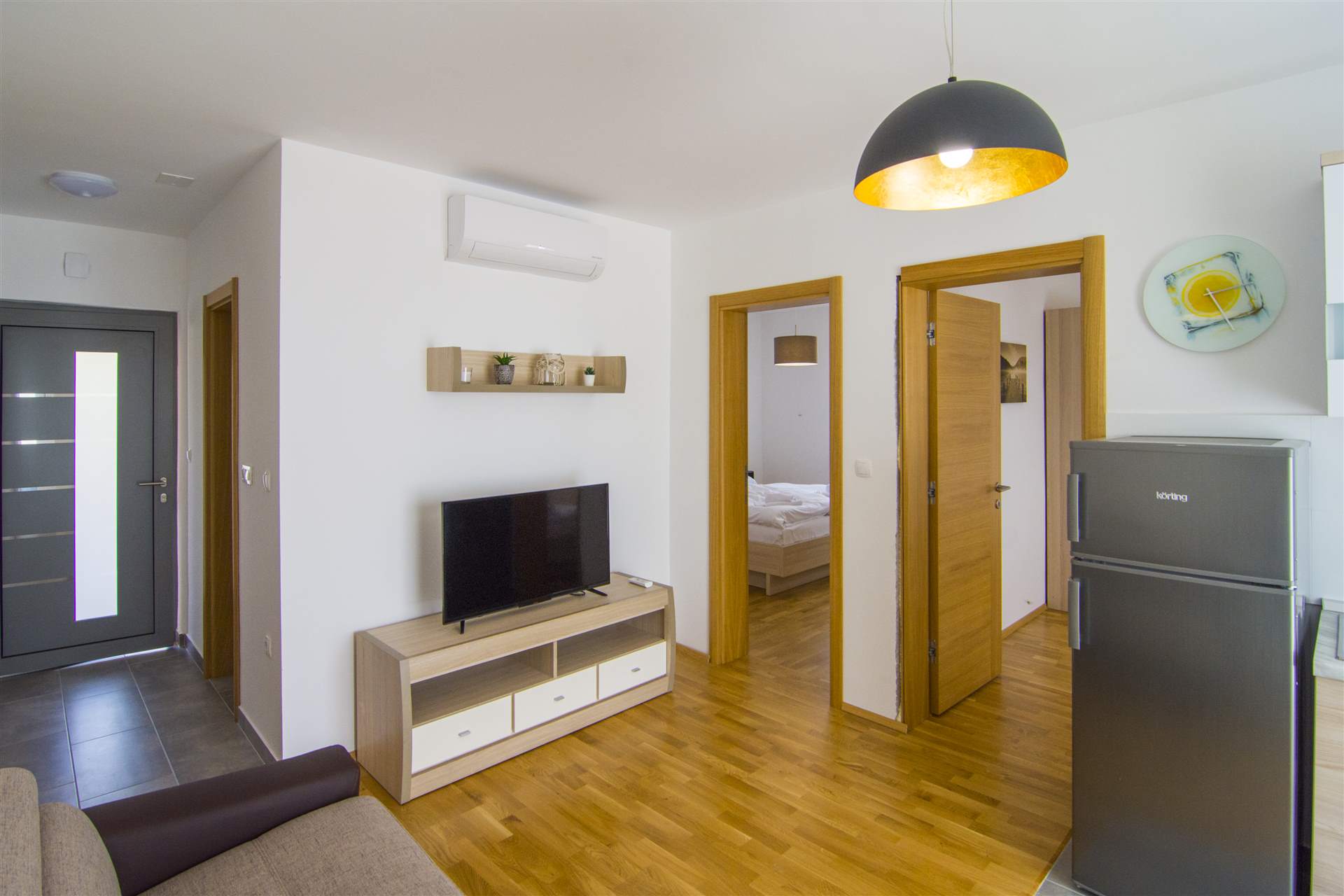 Beautiful new apartment with very comfortable beds. Air conditioning in lounge. Very secure with shuttered windows and high quality front door. Powerful shower. Located at the top of the hill with fantastic views. Lovely swimming pool. Ideal for families. 10 minute walk to town centre and beach but steep walk back. Taxis are cheap but the drivers seem to charge what they want and prices can vary. Lack of pavements on the walk into town means uneven paths so bring flat footwear! The supermarket is only a few minutes down the hill with everything that you need available. Zlatni rat beach is gorgeous and can be seen from the apartment. Overall a great stay in Bol. I would highly recommend. The only downside is it’s an out of town location but the views and peacefulness make up for that.