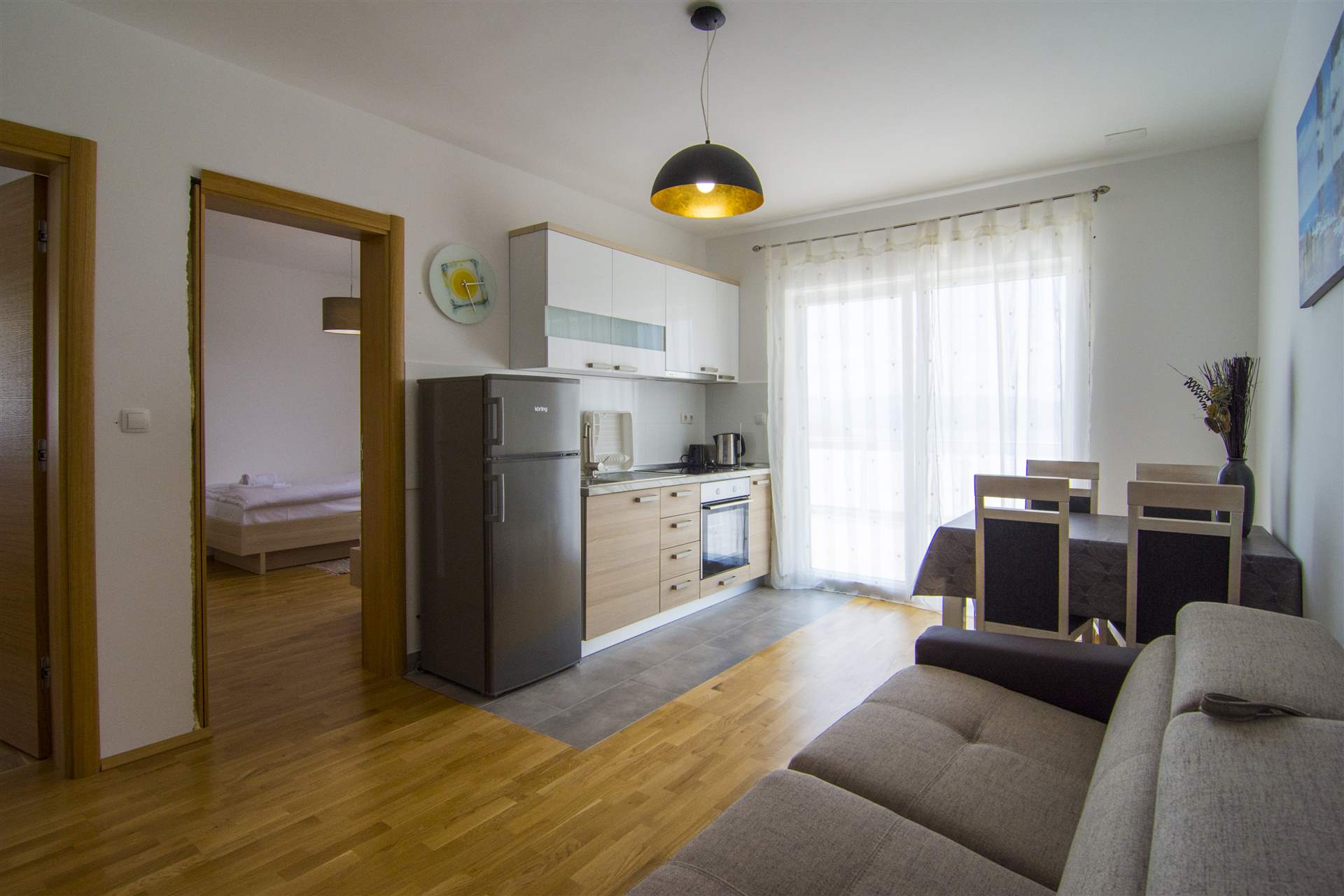 This apartment is located on the first floor of apartment building in a peaceful neighborhood only 10 minutes from center and 10 minutes to the nearest beautiful beach and 20 min walk to the Golden Horn. Hiking trail to Vidova gora starts only 50 m from the house. Nearest grocery store is 2 min walk from the apartment. It consists two comfortable bedrooms, one bedroom with double bed and one with 2 single beds. There is also spacious bathroom with shower and towels. It had open plan kitchen fully equipped for cooking on a daily basis with stylish dinging and living area, which also includes pull out sofa as additional bed for one person. Apartment is designed with functionality and simplicity in mind. From the living room and kitchen there is access to the balcony with sea view where you can enjoy your meals and relax. There is private parking place at the property and big pool and sun lounge for more enjoyable stay.